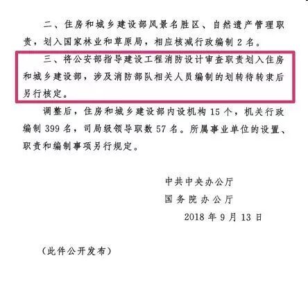2018年9月13日,中央办公厅正式发文(厅字2018第58号),将公安部指导建设工程消防设计审查职责划入住房和城乡建设部,涉及消防部队相关人员编制的划转待转隶后另行核定。