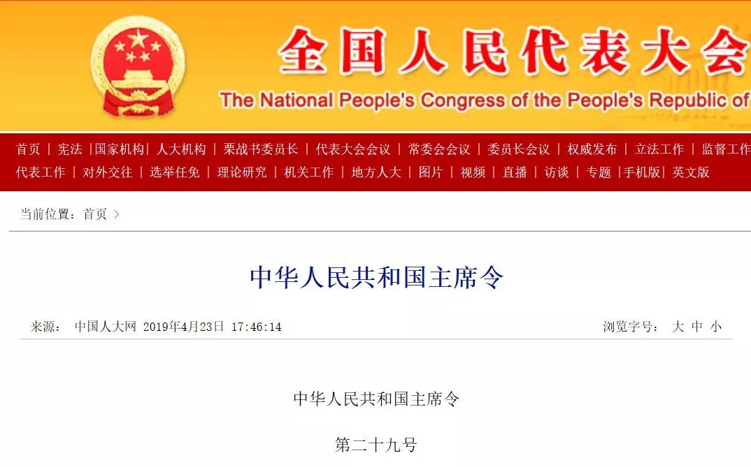 4月23日,全国人民代表大会颁布中华人民共和国主席令(第二十九号),修改《建筑法》《消防法》等八部法律,除《商标法》外,其他法律的修改条款自本决定公布之日起施行。